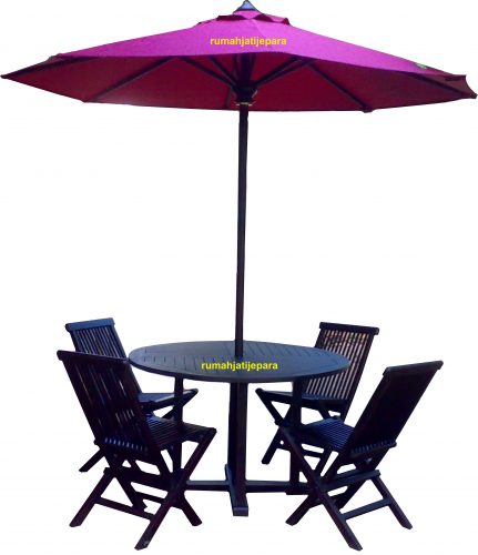 Terbuat dari 100% kayu Jati, satu set terdiri dari Meja ukuran diameter 120cm, Payung tinggi 250cm diameter 250cm, kursi standart yang bisa di lipat jumlah 4pcs. Kain payung menggunakan Polister waterproof. Warna bisa requst, sedangkan kwalitas kain bisa Upgrade.